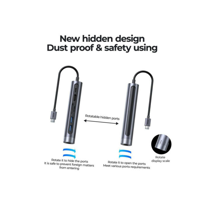Είναι ένα κομψό προϊόν υψηλής ποιότητας το οποίο είναι κατασκευασμένο από αλουμίνιο. Επιπλέον διαθέτει ιδιαίτερο σχεδιασμό χάρη στον οποίο, περιστρέφοντας το επάνω μέρος στο όποιο βρίσκεται η θύρα RJ45, καλύπτονται οι θύρες όταν δεν χρησιμοποιείται. Το design και η αίσθηση του μεταλλικού υλικού της κατασκευής δίνει ιδιαίτερο τόνο στο γραφείο σας, ταιριάζοντας αρμονικά με τις υπόλοιπες συσκευές σας. Στην συσκευασία συμπεριλαμβάνεται τσαντάκι μεταφοράς.-Υποστηρίζει ταχεία φόρτιση PD με μέγιστη απόδοση 100W