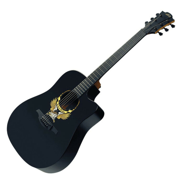 Ηλεκτρακουστική κιθάρα Tramontane Dreadnought Cutaway Wings of Freedom, με προενισχυτή Lag system. Καπάκι από μασίφ έλατο Canadian, μπράτσο, πλαϊνά και πίσω μέρη από Khaya Mahogany και ταστιέρα από Blackwood. Μαύρα Satin μεταλλικά μέρη, χρώματος High Gloss Black.