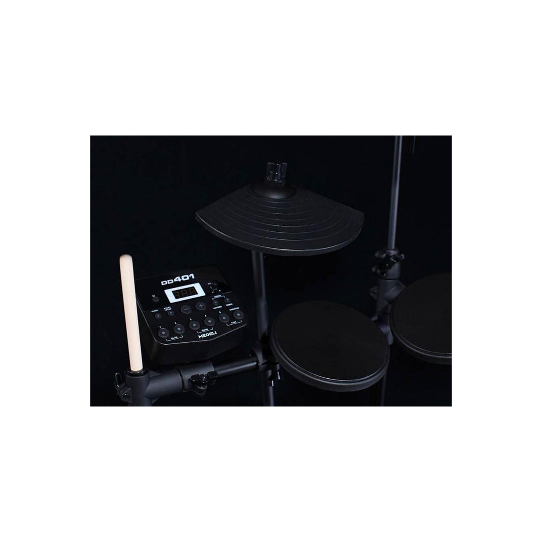MEDELI DD401RL Electronic drumkit with compact foldable rack and led light Complete kit with pre-assembled rack with fast mounting LED Illuminated drum and cymbal pads for improved coach mode 10 preset drumkits and 200 voices 30 preset songs and 12 loops Coach mode with different modalities to suit any level and LED light stroke indication Aux In input to connect external devices such as smartphones or tablets and play along with your favorite songs Headphone input for quiet practicing Metronome function USB output to connect with PC/MAC using MIDI protocol to connect with several software